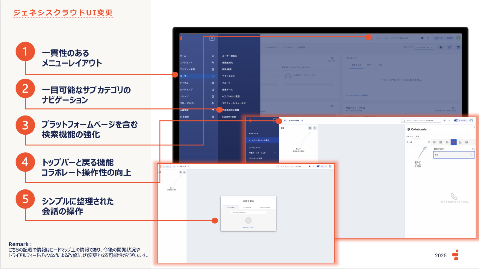 Genesys Cloudの全体的な操作性を改善するため、新しい統一ナビゲーションの導入(UIの変更)が予定されています。これにより、ユーザーが目的の機能に、より直感的にアクセスできるようになります。