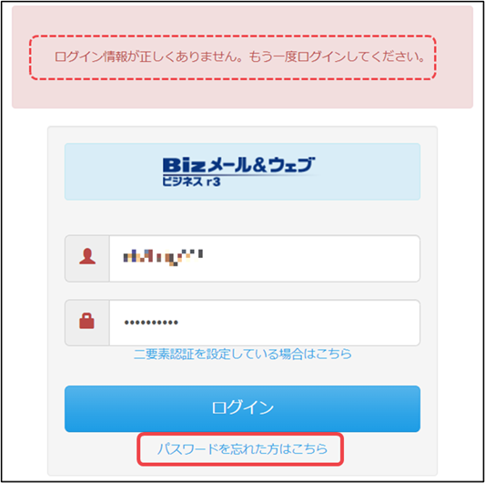ログインに失敗した場合は、下図のようなメッセージとリンクが表示されます。[パスワードを忘れた方はこちら]をクリックしてください。
