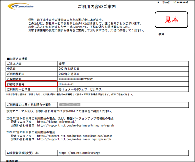 ご契約時に当社より発行された『ご利用内容のご案内』または、オンラインページの『カスタマーサポートデスク』でご確認いただけます。