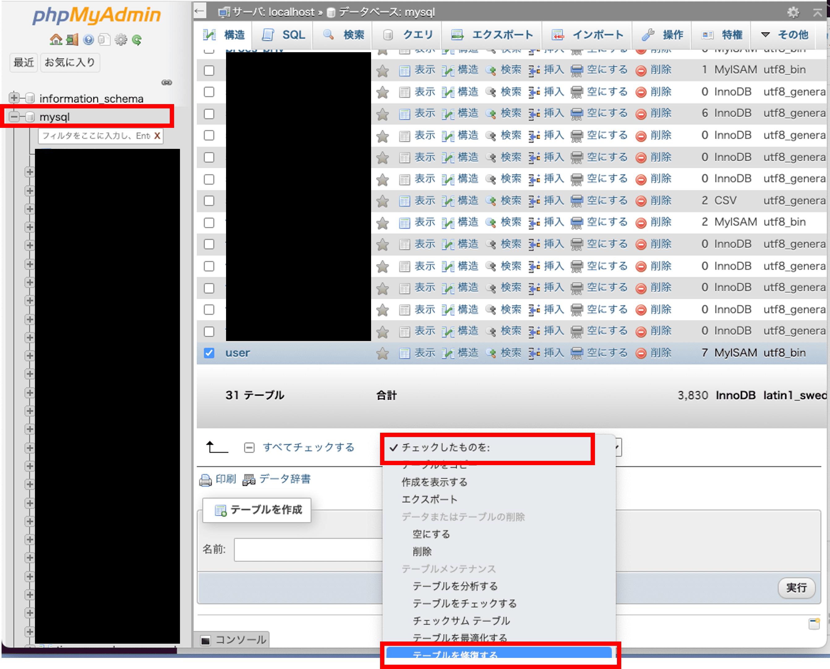 4)右ウィンドウの下に「チェックしたものを:」のプルダウンがあるので、テーブルメンテナンス中の「テーブルを修復する」を選択 してください。