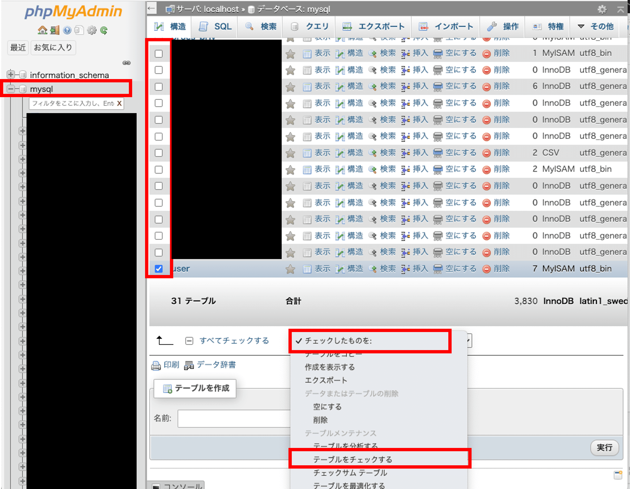 4)右ウィンドウの下に「チェックしたものを:」のプルダウンがあるので、テーブルメンテナンス中の「テーブルをチェックする」を選択 してください。